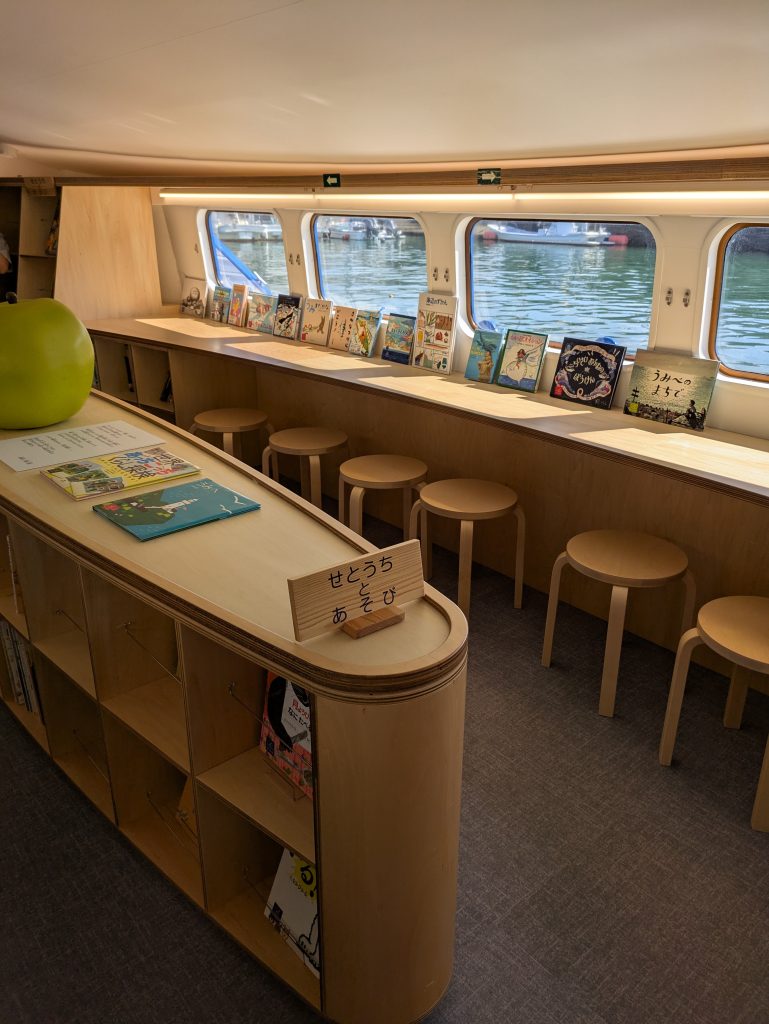 船内に入ると沢山のほんと、木の温かみであふれていました。船内には本が約2000冊あるそうです。